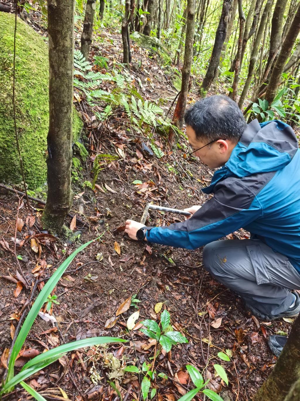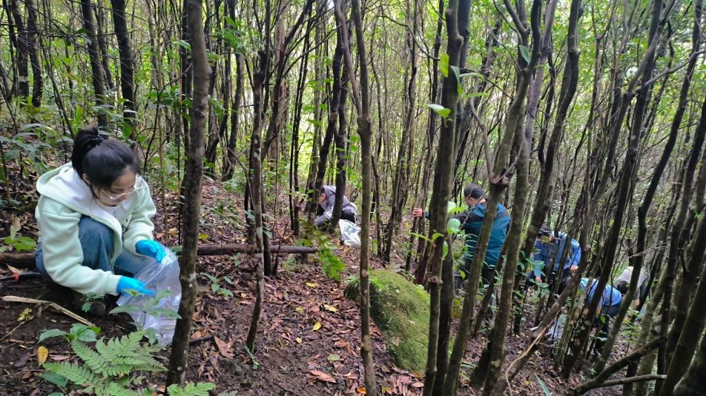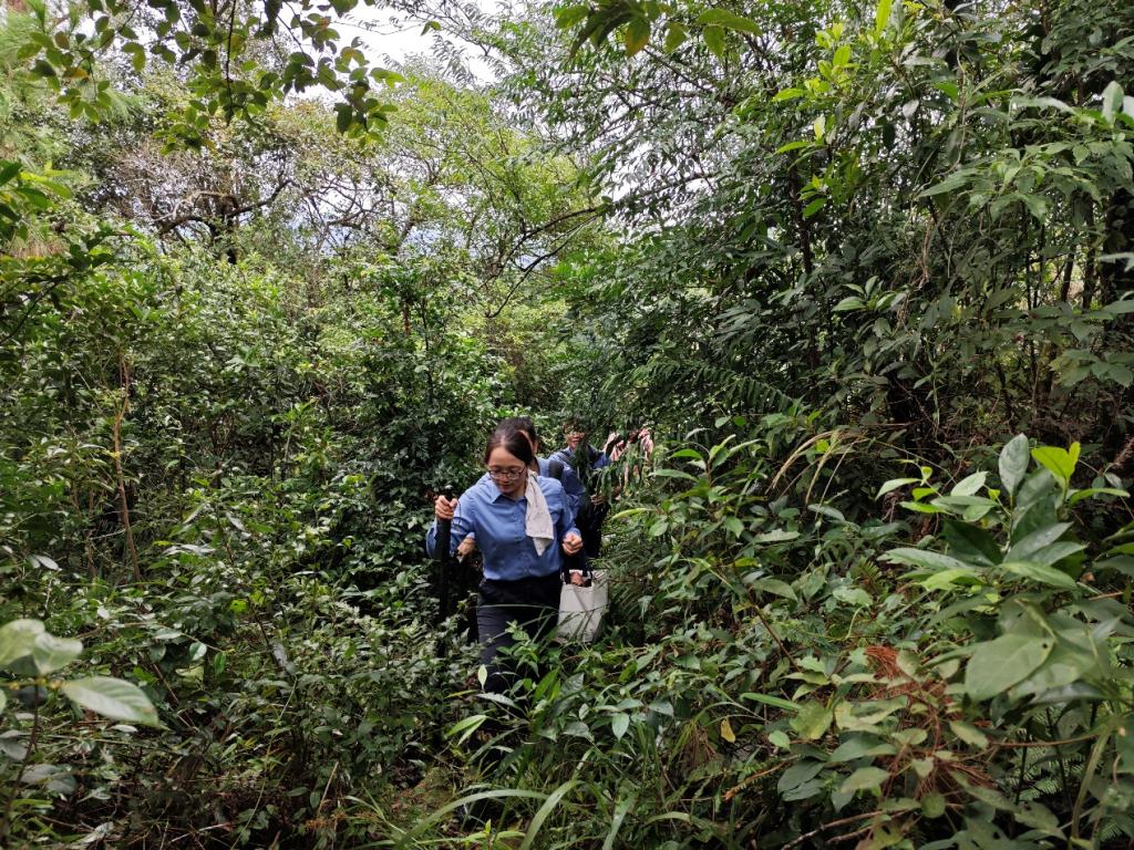 回归行动当天,郑希龙老师、温圣平老师带领杨胜杰、郭吉霞、刘玉梦三位研究生,与云安区检察院、云安区林业局的代表组成行动小组,向着云雾山海拔约1000米、腐殖质丰富的预定区域进发。山间路径崎岖,大家手提种苗、肩扛工具,一步步徒步抵达目的地。