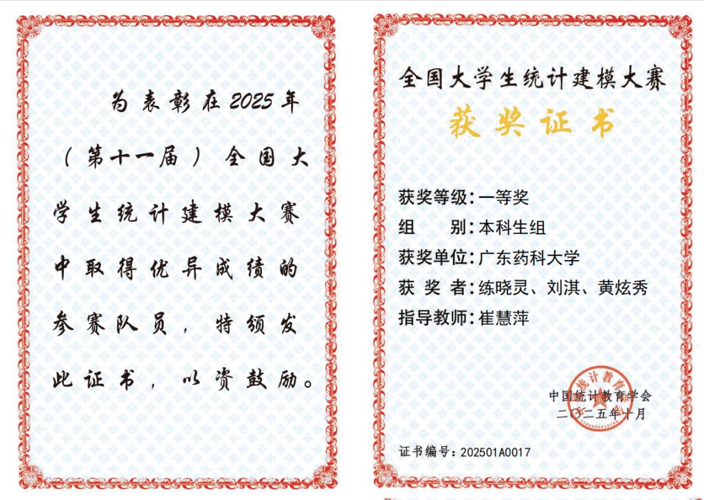 2025年10月27日,从第十一届全国大学生统计建模大赛总决赛现场传来喜讯,广东药科大学中药学院学子练晓灵、刘淇、黄炫秀组成的参赛团队,凭借作品《基于多组学整合与半监督机器学习的肝细胞癌预后预测模型构建与评估》,勇夺本科生组全国一等奖,实现我校在该项比赛全国一等奖零的突破。