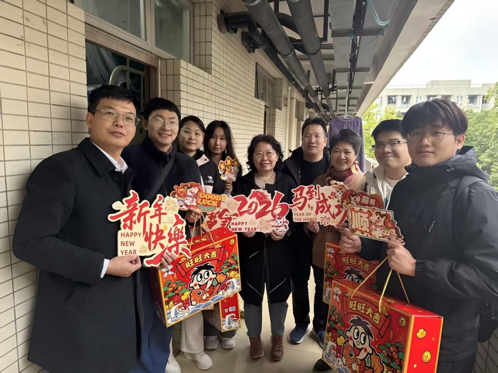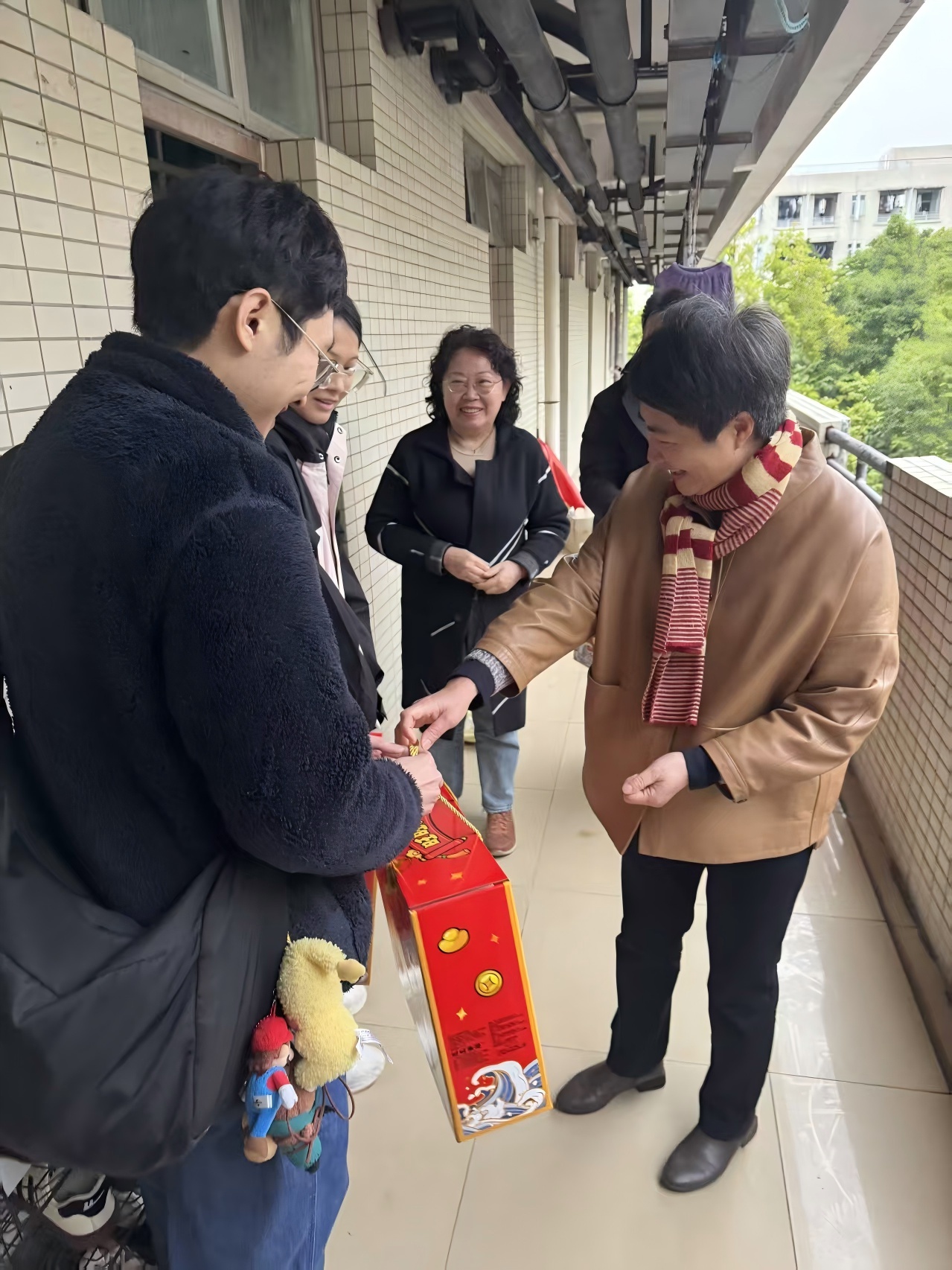 在大学城校区,学院党委书记杨苑芬、院长何新、党委副书记刘志挺、副院长时军一行深入学生宿舍,与留校学子们亲切交流,细致询问他们的科研进展、论文撰写、假期生活及就业规划情况,叮嘱大家务必注意实验室与宿舍安全,做好健康防护,并常与家人联系报平安。学院领导特别关心毕业年级学生的求职进展,鼓励大家利用假期查漏补缺,为顺利就业或深造做好充分准备。慰问中,学院为同学们送上了寓意“学业兴旺、前程旺旺”的旺旺大礼包,让学子们在寒冬中感受到来自学院大家庭的浓浓暖意。
