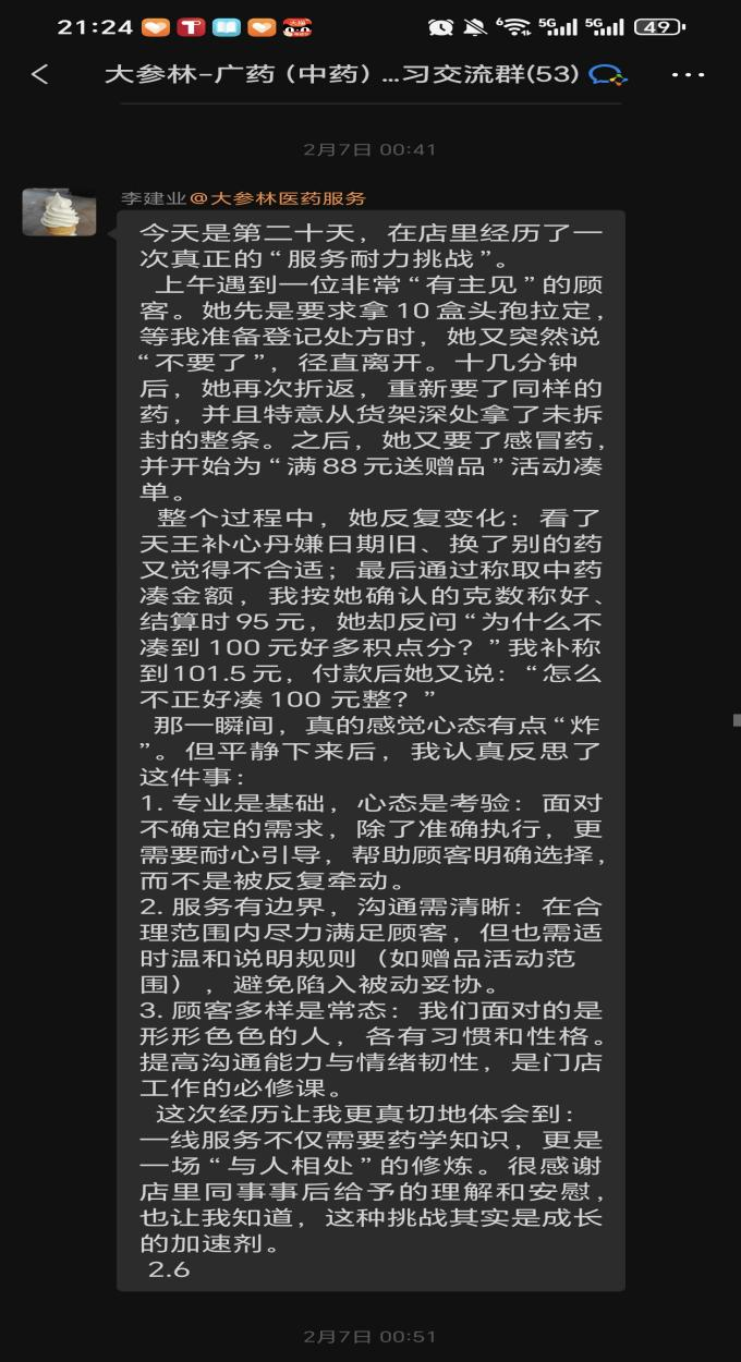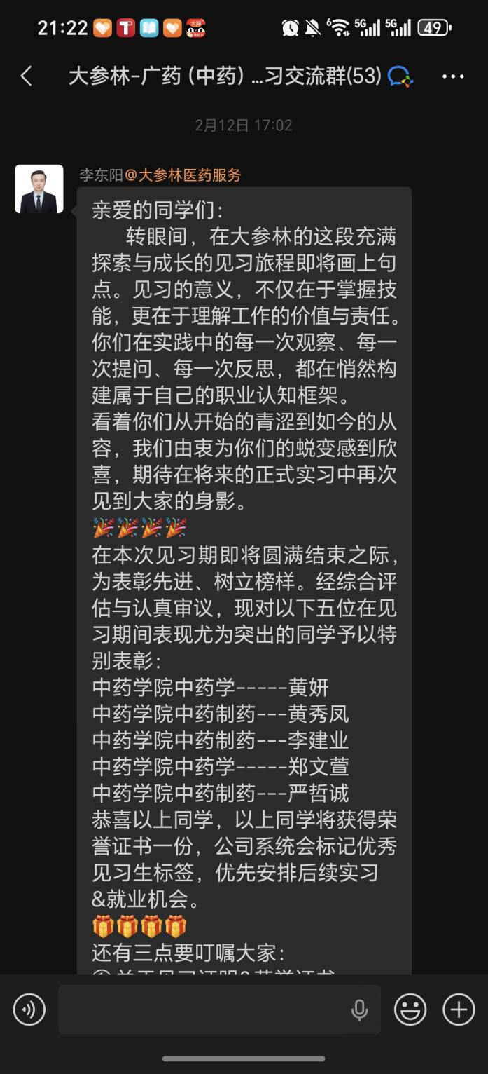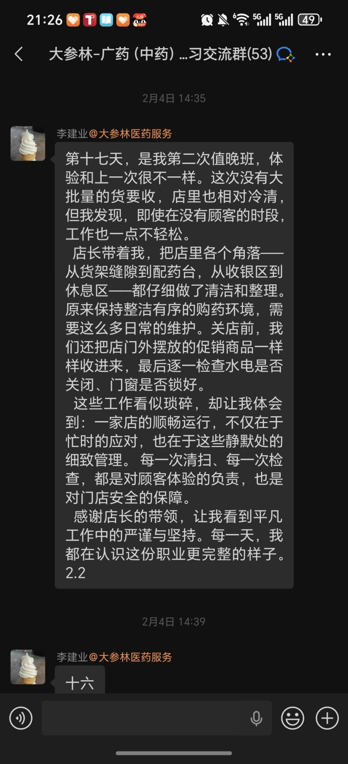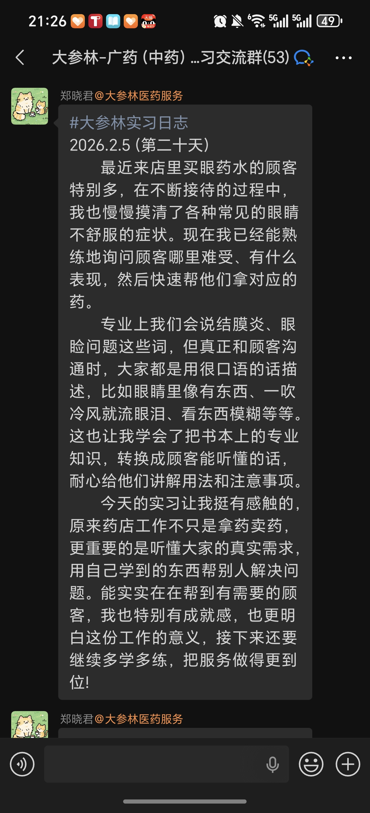 实践交流群里,满是同学们的成长与感悟:有人为第一次独立完成收银倍感自豪,迈出了理论转实操的关键一步;有人暖心帮扶跌倒的独居老人,真切体会到医药服务的温度与责任。一个月的实践,不仅巩固了《中药鉴定学》《临床中药学》等专业知识,更锤炼了沟通能力、责任意识与人文素养,让大家实现了从“学知识”到“懂服务、能做事”的蜕变。