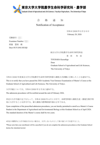 新春佳节刚过,我院就传来了本科生升学的好消息——中药资源与开发专业2020级本科生欧阳慧琪同学,成功拿到东京大学农学修士(硕士研究生)的录取通知书。这份沉甸甸的录取,背后是她从偶然埋下留学种子,到跨越重重困难、两次冲击目标的坚持,也为我院本科人才培养再添一份亮眼答卷。