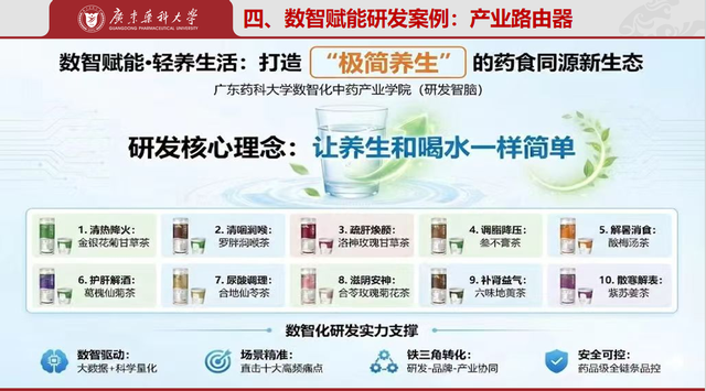 从“卖产品”到“送健康”: 在与国药药材(佛山)合作的“药食同源数智草本茶系列”项目中,学院不仅利用大数据精准洞察消费需求、完成科学配伍,更与品牌方共同倡导“轻养生”“场景化”的健康生活方式。一瓶普通的草本茶,通过数智赋能,变成了陪伴用户日常的“健康管理师”,实现了从传统制造向“制造+服务”的跃升。