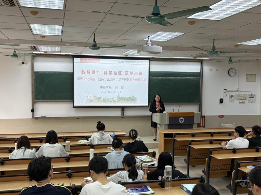 4月10日,中药学院院长何新教授以“数智赋能、科学循证、筑梦未来—坚定文化自信,坚持守正创新,筑牢产教融合创新根基”为题,围绕对习近平总书记关于中医药工作的重要指示精神,为中药学23级学生讲授春季开学思政第一课,勉励青年大学生在思想洗礼中坚定理想信念,在明确方向中凝聚奋进力量。