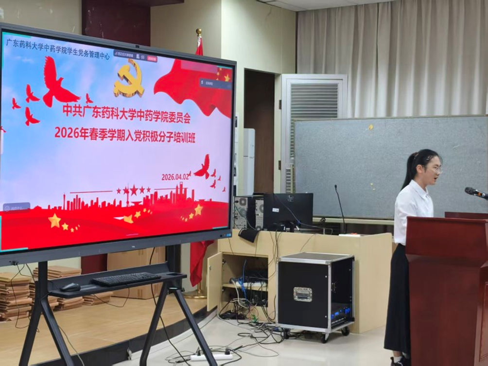 丹桂飘香传新火,青春向党启新程。为强化青年学子理想信念教育,深化对党的理论与使命的认知,引导学员在实践中锤炼品格、提升素养,中药学院学生党务管理中心于2026年4月2日下午在大学城中药学院多媒体会议室举办“2026年春季入党积极分子开班仪式暨书记党课”。学院党委杨苑芬书记、学生党务中心负责老师张轩辉、2026年春季入党积极分子教师王红刚、蔡家乐以及大学城、云浮校区120多位本科生研究培训学员参加了开班仪式。会议由中药学院学生党务管理中心实践培训部王畅同学主持。