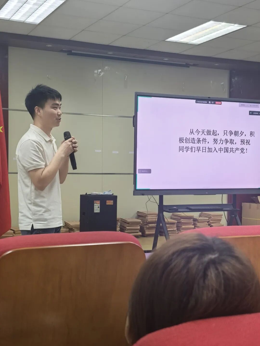 学员蔡家乐老师结合自身在广药大本科求学、其他高校硕博深造与返校工作经历,分享了自己重新申请入党的心路历程。他坦言曾错失入党机会,后受身边同志优良作风与疫情期间党员担当所感染,思想上主动向党组织靠拢,坚定了重新入党的决心。作为师兄,他勉励同学们珍惜在校时光,找准目标定位,在学习与成长中不断提升自己。杨苑芬书记也以蔡老师从受挫不放弃、始终坚守入党初心并不断精进学业、成长为优秀博士的事例,号召大家向其学习,以实际行动向党组织靠拢。